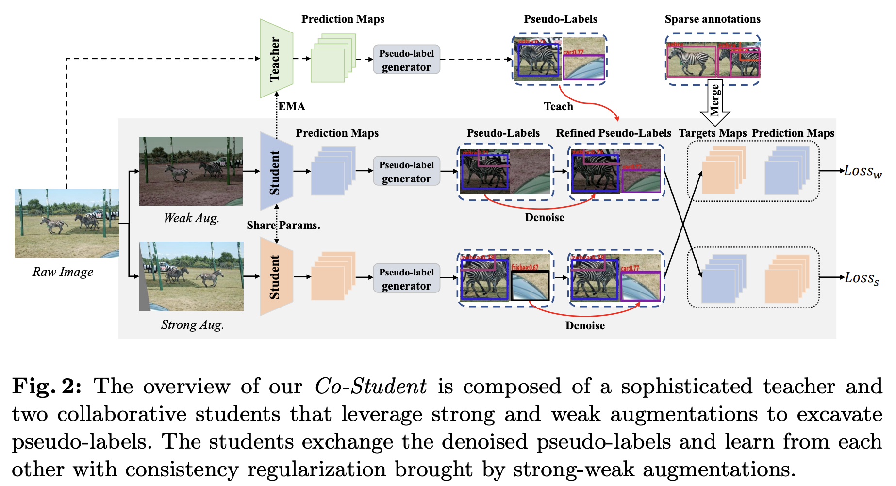 co-student는 denoising을 하는 teacher detector와 2개의 student로 이루어져있다. 두 student는 같은 파라미터를 공유하며, teacher는 student의 smoother version으로 EMA를 통해 업데이트된다. raw image는 teacher, weak와 strong image는 student에 각각 입력된다. FCOS를 이용하여 classification map, regression offset map, centerness map을 예측하여 pseudo label set을 생성한다. 각 pseudo label은 teacher model의 pseudo label로 수정되며, sparse annotation과 함께 합쳐진다. 이를 통해 수정된 student의 GT가 생성되며, 더 정확한 supervision을 제공할 수 있다. 또한, 이는 EMA를 통해 teacher의 denoising 능력도 향상된다.
