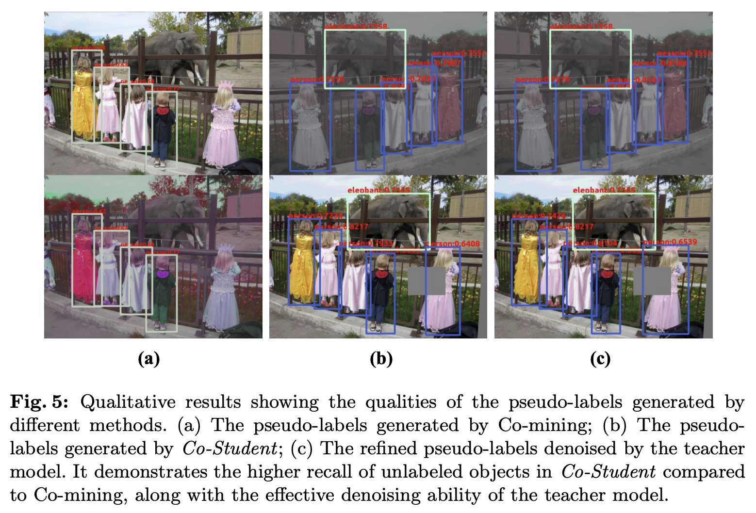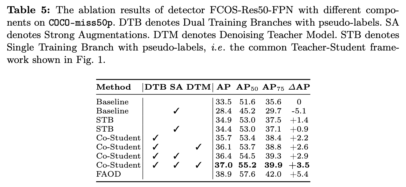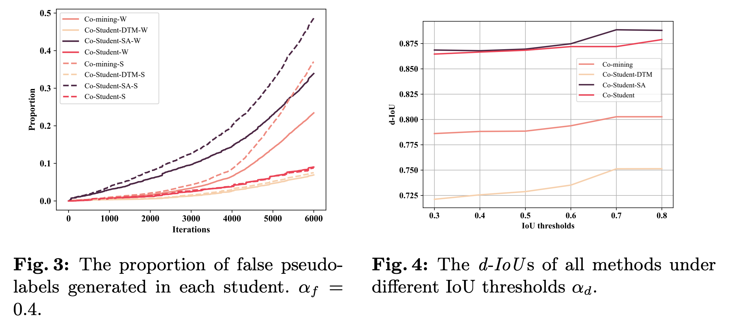 Figure 3과 같이, Co-Student-DTM에서 DTM의 효과를 증명하기 위해 false pseudo label이 얼마나 많은지를 확인한다. 1. IoU가 임계값보다 작고 2. 최대 IoU를 가지는 pseudo label이 annotation과 class가 맞지 않을 경우 fasle pseudo label로 취급한다. DTM을 사용하는 Co-Student-DTM과 Co-Student의 false label의 비율이 작은 것을 확인했으며, SA의 noise를 제거하여 부정적인 효과를 감소시킨다.