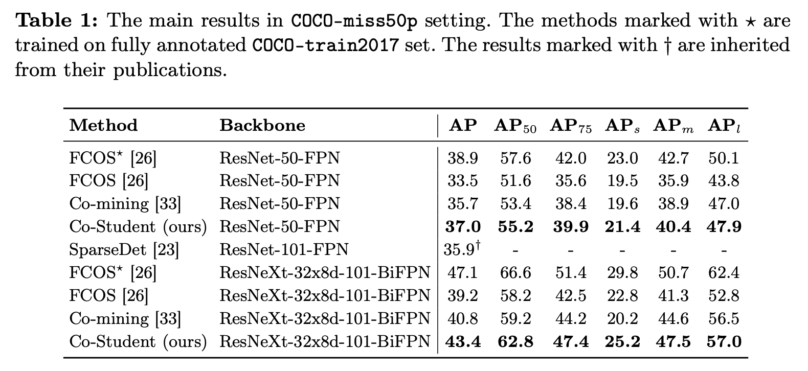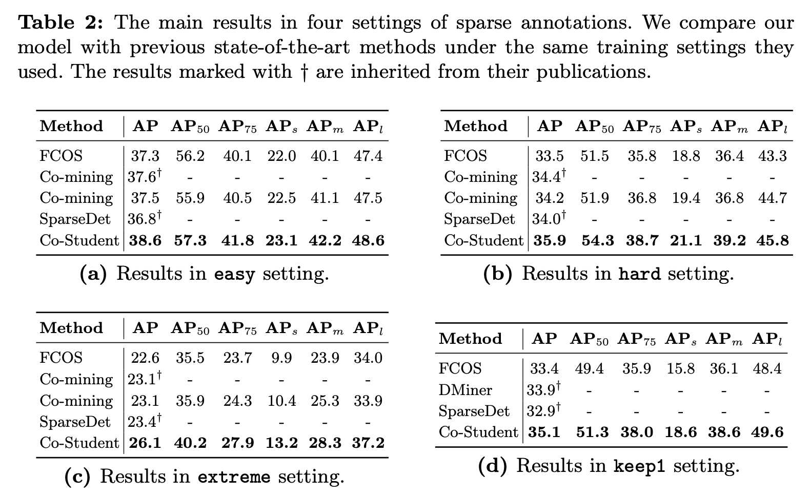 Sparsely Annotated Object Detection(SAOD)는 불완전한 라벨링 문제를 다룬다. Fully Annotated Object Detection(FAOD)에 비해, SAOD는 더 복잡하고 도전적이다. 라벨링 되지 않은 객체는 잘못된 supervision을 줄 가능성이 있으며, 이로 인해 객체탐지에 안 좋은 영향을 끼칠 수 있다. SAOD와 FAOD의 성능차이를 줄인다면 라벨링 비용을 줄이는데 기여할 수 있다. pseudo label을 사용하는 현존하는 방법들은 두가지 문제가 있다. (1) student detector로부터 탐지하는 unlabel 객체를 모두 사용하지 않는다. (2) pseudo label은 많은 noise를 가진다. 이 두가지 문제를 해결하기 위해 teacher, student detector로부터 얻은 pseudo label을 모두 사용하여 SAOD와 FAOD의 차이를 줄이는 Co-Student를 설계한다. Co-Student는 pseudo label의 노이즈를 제거하는 teacher와 strong, weak augmentation을 적용한 두 개의 student로 구성된다. 두 student는 노이즈를 제거한 pseudo label을 교환하며 각자 학습을 진행한다. Co-Student는 one-stage detector(FCOS)를 활용하여 sparse annotation에서 SOTA 성능을 달성하였다. 또한, fully annotate로 학습한 FCOS에 비해 95.1% 성능을 달성하였다.
