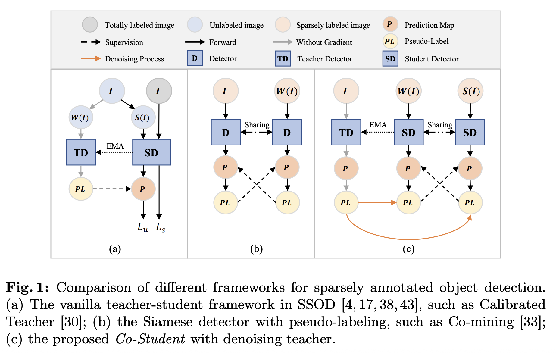 - Co-Student라는 새로운 SAOD 프레임워크를 제시한다. 이 프레임워크는 Strong, Weak annotation을 사용한 두 Student가 더 많은 pseudo annotation을 찾고, 서로 정보를 교환한다.