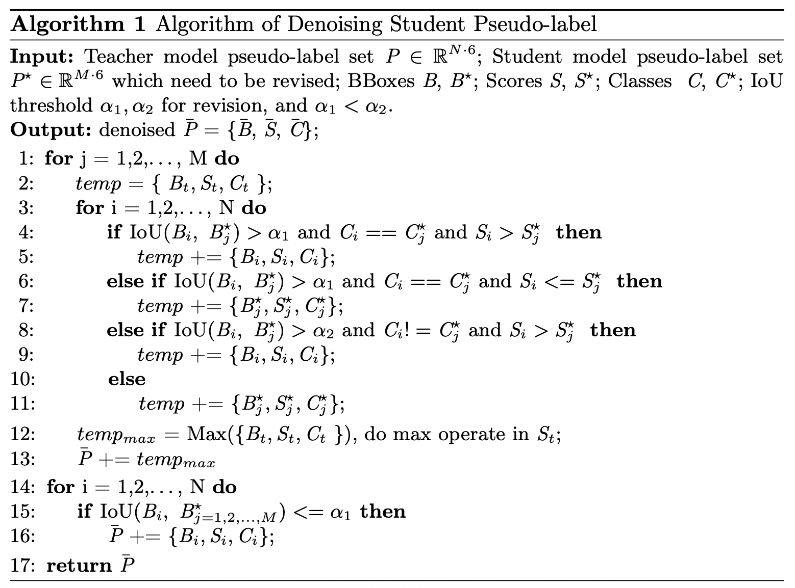 raw, weak, strong branch 3개 각각의 pseudo label은 특정 transformation을 하고 있기 때문에 바로 비교를 할 수 없다. 다라서 teacher를 weak, strong augmentation field로 맞춰준다. 그 후 teacher pseudo label P을 이용하여 student pseudo label P*을 denoise한다. IoU, class, score 유사도를 비교하여 결정한다. 예를 들어, 알고리즘 1과 같이 IoU가 임계값을 넘고, class, score가 맞다면 P*은 P로 수정된다.