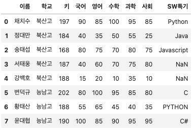 'SW특기' : ['Python', 'Java', 'Javascript', '', '', 'C', 'PYTHON', 'C#']