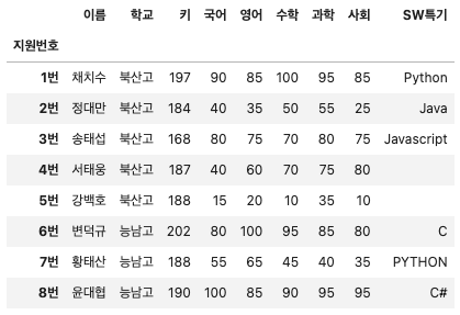 df = pd.read_csv('score.txt', sep='\t', index_col='지원번호') # index 설정
