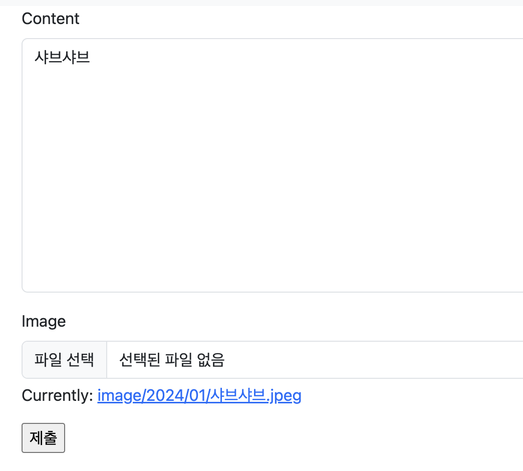 update버튼을 누르면 아래와 같이 content, image가 그대로 불러온다는 것을 알 수 있다.