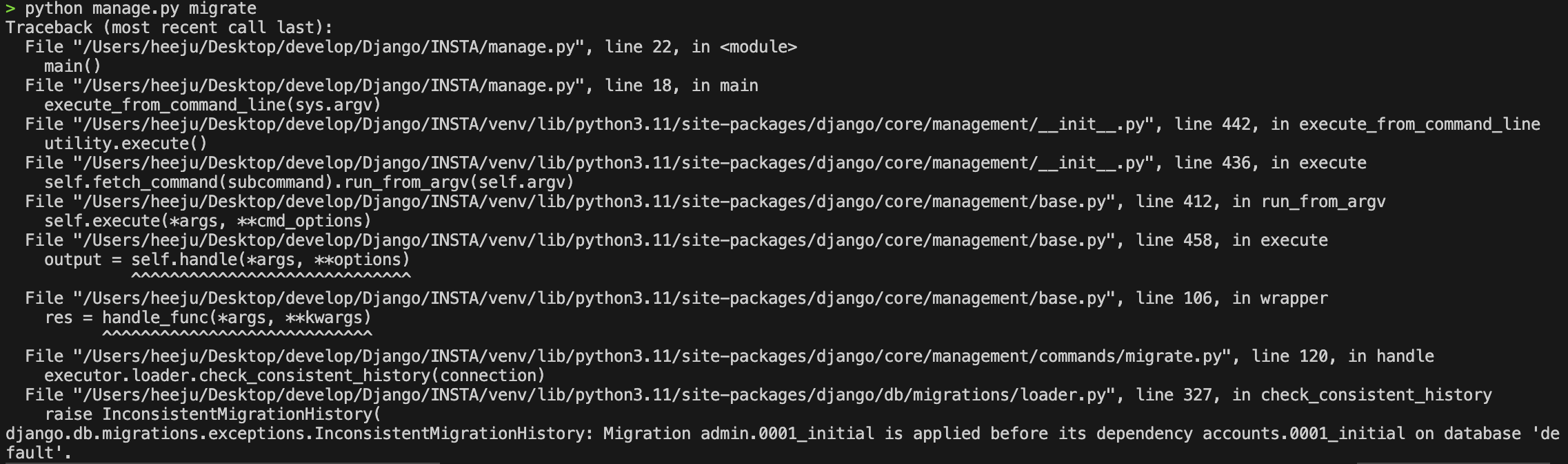 이후 migrate를 해야 하는데 이미 데이터베이스가 생성되어 있는 상태에서는 오류가 발생한다.