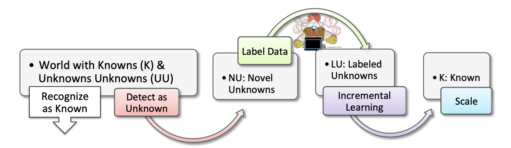 Towards Open World Recognition https://arxiv.org/pdf/1412.5687 0. Abstractreal world에서 recognition은 조절되어있는 실험실 환경에서 나타나지 않는 challenge들을 가진다. dataset은 dynamic하고 novel category는 계속해서 탐지되고 추가되야 한다. 이러한 문제들을 다루기 위해 저자들은 Open World recognition을 제안하고 정의한다. open world recognition system을 평가하기 위한 protocol과 객체의 카테고리를 점차 추가하고 모델을 효율적으로 진화시키는 NNO(Nearest Non-Outlier) 알고리즘을 제시한다. 1. Introductionopen world ..